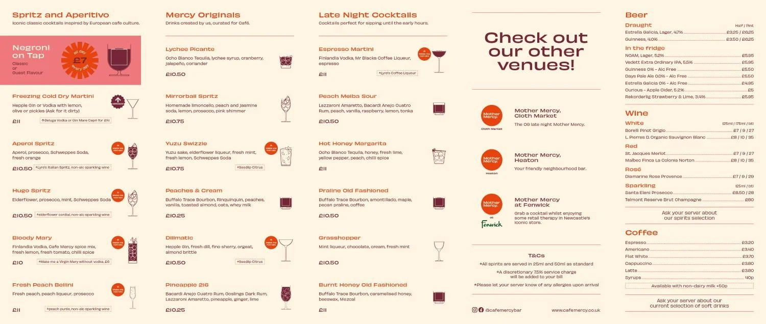 Iconic aperitivo cocktails, house originals, and refreshing spritzes, all crafted with quality ingredients and a little Mercy personality.
